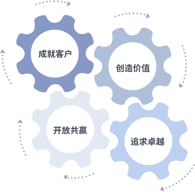 成就客户是一切决策的出发点,,创造价值是衡量所有工作的标准,,,,追求卓越是我们做事做人的态度,,,开放共赢是我们的格局也是最终的结果。。。价值观的齿轮环环相扣,,推动着组织里的每个人不断向前。。。
